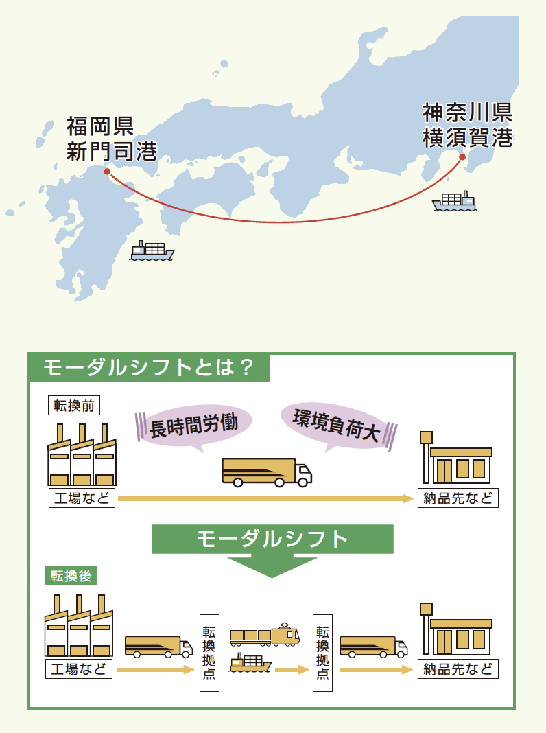 2021 年 7 月 1 日、横須賀港と福岡県北九州市の新門司港を 21 時間で結ぶフェリーが就航しました。トラックドライバーの長時間労働の低減や、長距離輸送による CO2 排出量を削減する海上輸送へのモーダルシフト(自動車で行われている貨物輸送を環境負荷の小さい鉄道や船舶の利用へと転換すること)として注目を集めています。