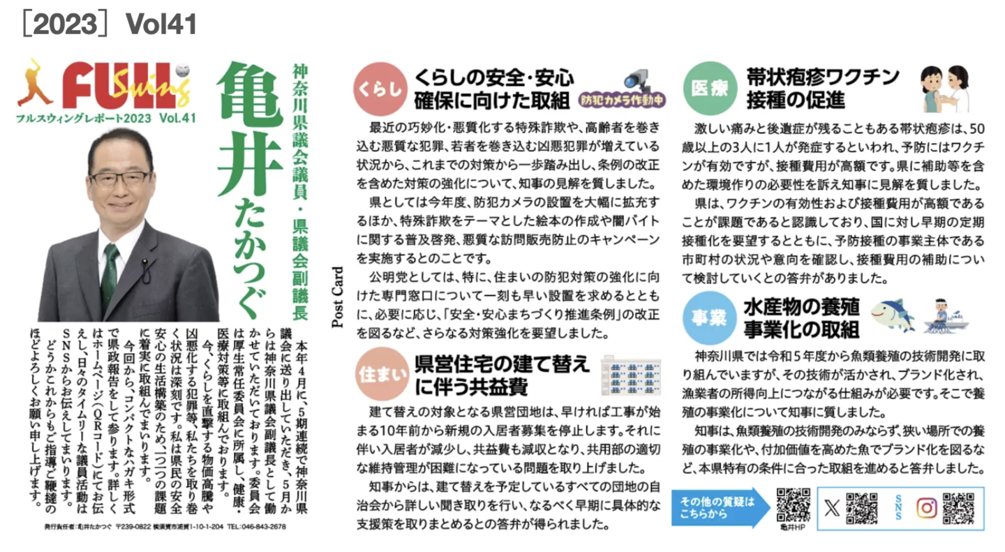 亀井たかつぐは公明党横須賀市議団とも連携し、フェリー誘致と港湾物流の活性化を要望してきました。また、本町山中有料道路の無料化や、三浦縦貫道路・林 IC の全面開通など、市内の道路の利便性を向上させることで、市内および首都圏への物流・輸送に貢献しました。これからも公明党の「国・県・市のネットワークの要」として、横須賀の未来を開きます。